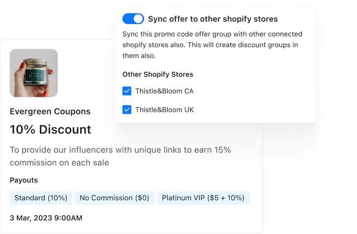 - Cascading promo codes: Create a promo offer in one Shopify store and automatically have the same promo codes available in other connected stores.