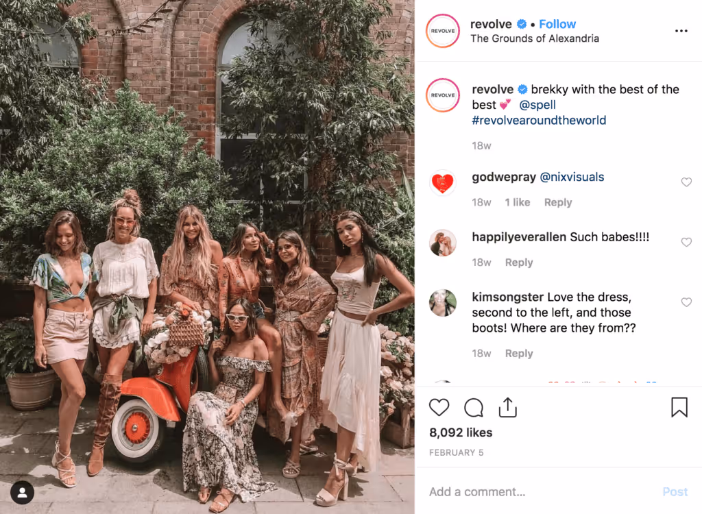 Other brands are taking a page out of Revolve’s playbook by inviting influencers on lavish getaways. Last year, Boohoo jetted off to Mexico with their brand ambassadors to promote their spring break collection. More recently, Shopbop escaped to Lisbon and Lake Como with a handful of fashion influencers, who strutted around in the brand’s trendy pieces and covered the euphoric vacation in real time on social media.