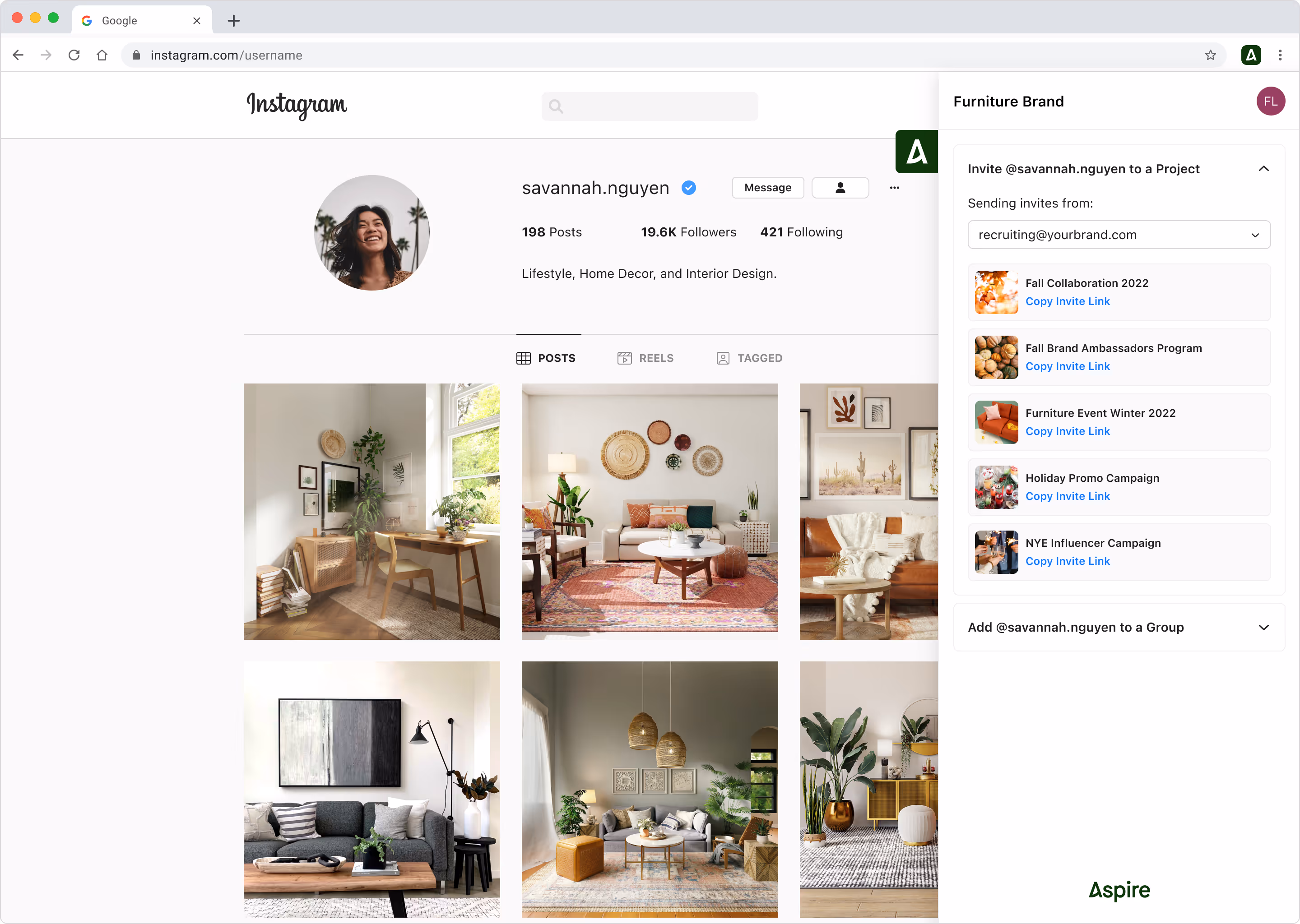 Lastly, we built a free Chrome Extension to allow marketers to search, invite, and import creators to your Aspire campaign — directly from your Chrome browser. The extension is compatible with Instagram, TikTok, Pinterest, and YouTube.