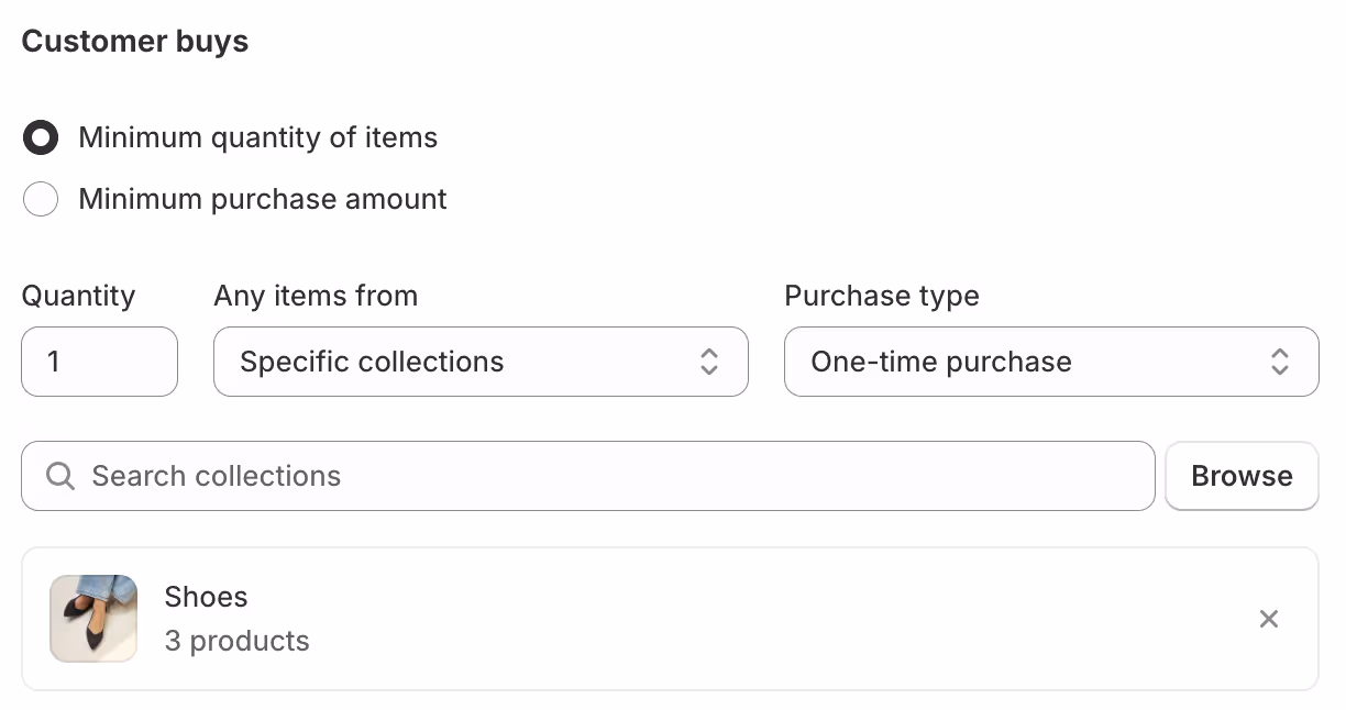 In the Customer buys section, set the minimum quantity or purchase amount required and add the eligible products or collections.
