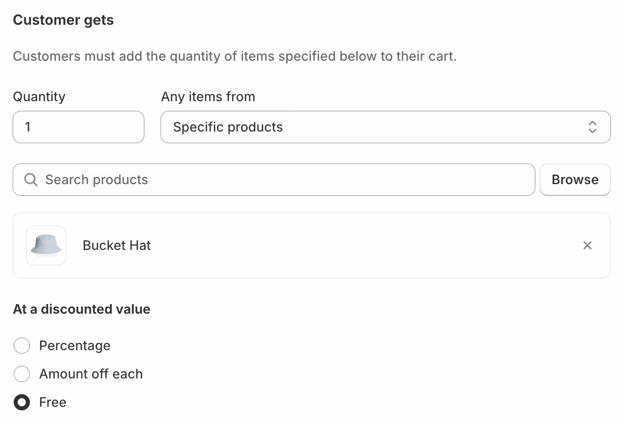 Under the Customer gets section, choose the discounted items, set the discount type (percentage, amount off, or free), and optionally limit the number of uses per order.
