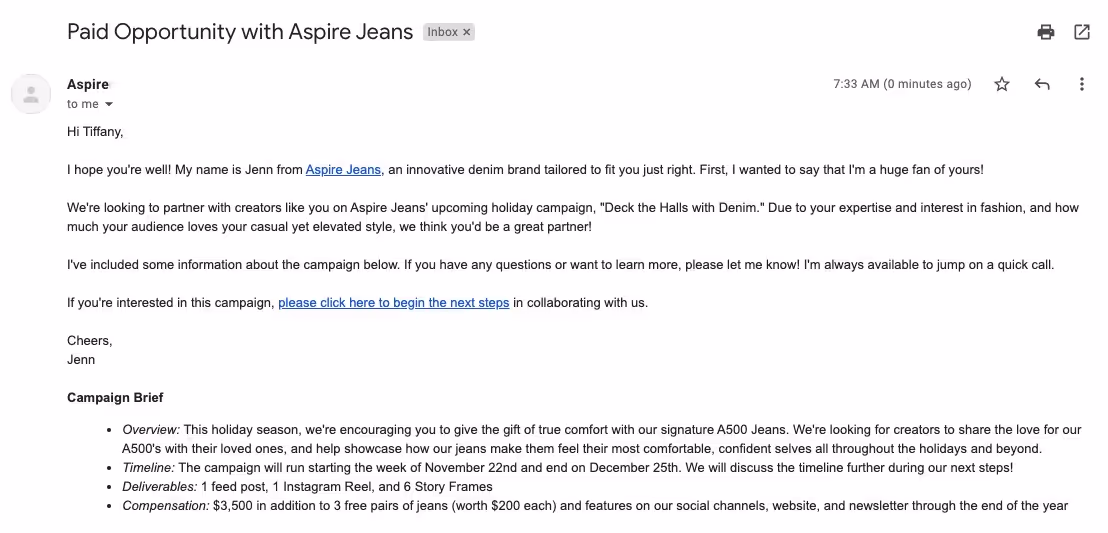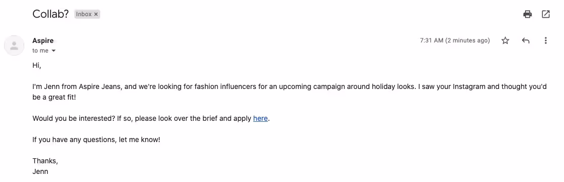 As you can see, this email doesn't have any personalization — no first name, nor anything specific about why the influencer stood out.