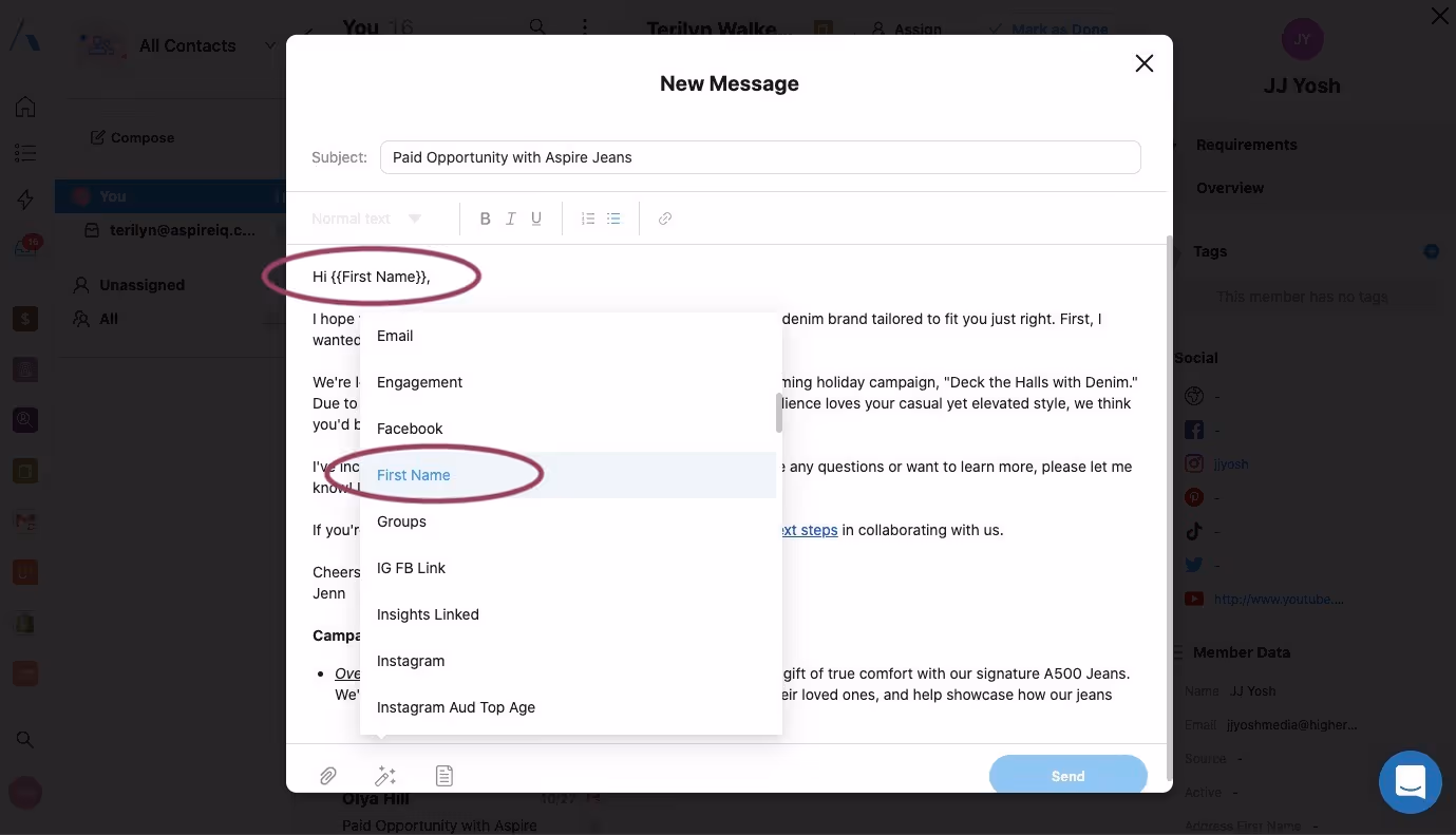 On Aspire, you can easily automate some of the personalization using tags, as shown below. With the magic tool, you can turn a personalized token like {{First Name}} into each influencer’s name with ease.