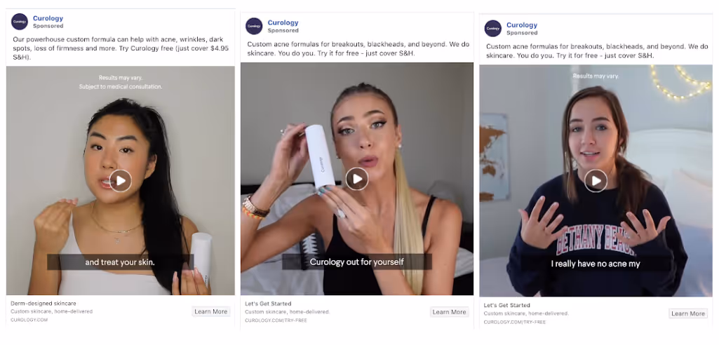 This type of influencer-generated content (IGC) is often repurposed into a brand-owned paid ad across various channels, which runs under the brand’s handle. Take a look at Curology. The cult favorite skincare brand worked with influencers to create video content around their acne journeys, then repurposed them into brand-owned ads on Facebook. By utilizing IGC to power its paid ads, Curology is able to make its brand more human and provide social proof from its community.