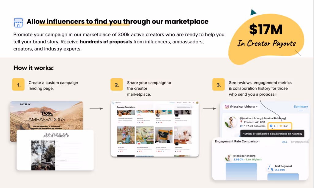 Discovery doesn’t end with outbound search — we also allow influencers to find you. We’ve got a robust creator marketplace, which is a pool of active creators who are signed up to our platform and ready to review your brand’s proposals as soon as you submit them. This means that you can submit a campaign in our marketplace and get hundreds of proposals from creators who are interested in your brand.