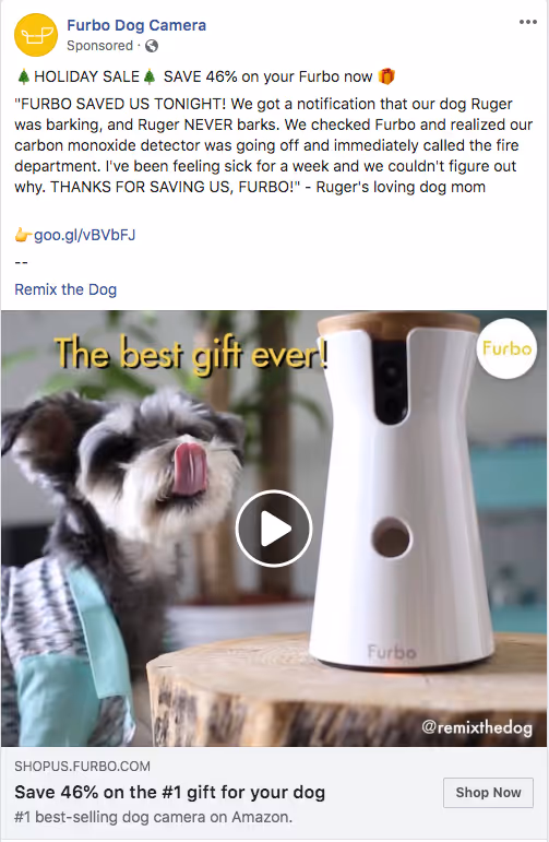 Whether you pull it from reviews or direct interactions with customers, their authentic love for your products will give your brand more credibility and provide social proof. Additionally, by featuring a direct quote from a customer in an ad, you’re allowing them to be part of the brand building process. Below, Furbo Dog Camera highlighted one customer’s amazing story about how its product saved their home.