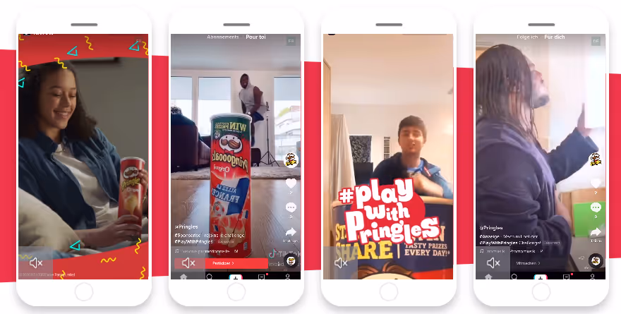 Branded Hashtag Challenges represent a sweet-spot between user creativity and engagement. You can promote a sponsored hashtag via In-Feed video ads, or via banners on the Discover page, and challenge users to create their own content featuring that hashtag. If you hit the right chord, the hashtag will go viral and draw in huge numbers of participants. Pringles smashed the branded hashtag with its #playwithpringles challenge, which attracted over 1 billion views.