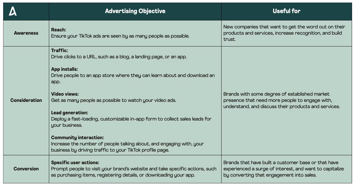 First thing’s first: when you set up your campaign, you’ll be guided to choose your advertising objectives. The TikTok Ads manager organizes 7 objectives into 3 categories: awareness, consideration, and conversion – each of which describe different business goals.