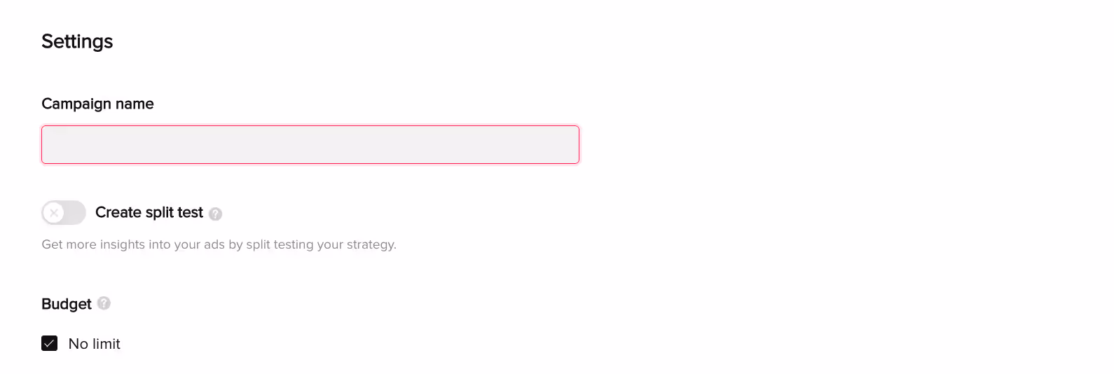 After choosing a name, you’ll set your campaign’s budget. Budgets can be set to specific amounts, such as daily limits or lifetime spends, but you’ll also have the option to set your campaign budget to ’No Limit’. Choosing ‘No Limit’ will enable you to share unlimited ads at the campaign level and only face restrictions if there are any confirmed budgets at the Ad Group level (we’ll talk more about Ad Groups next).