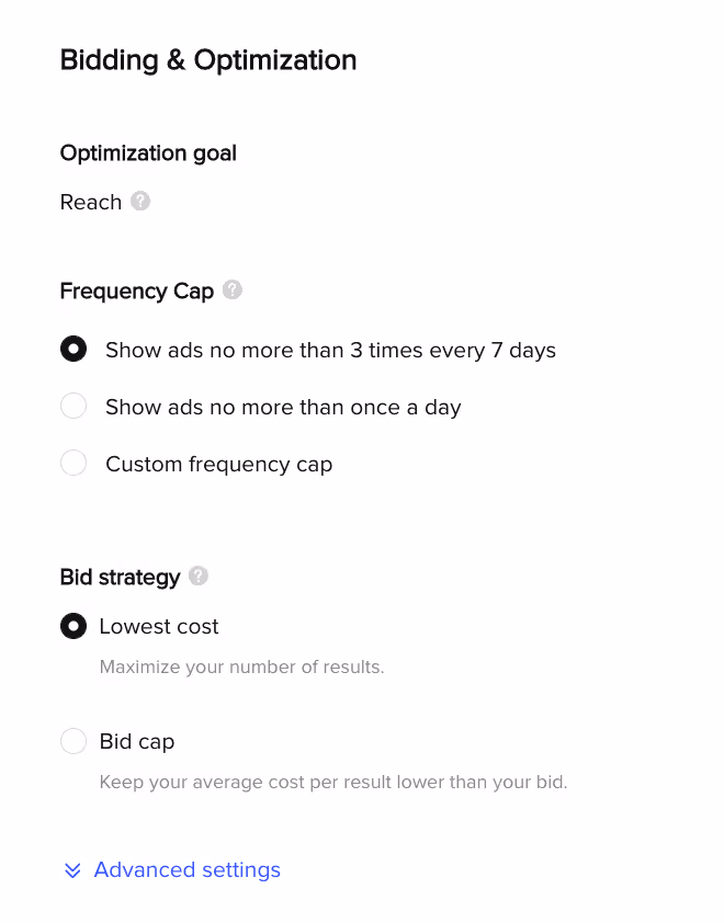 - Bidding strategy: Choosing a cap will ensure you never spend more than your bid amount. However, if your cap is set too low you may end up not spending your daily or lifetime ad budget.