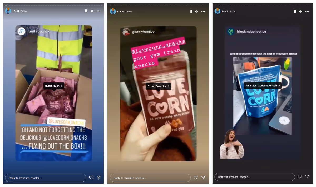 Snack brand Love Corn is a pro at finding and sharing UGC. It has a dedicated Instagram Stories Highlight that showcases the pictures and videos that fans of the snack have shared.