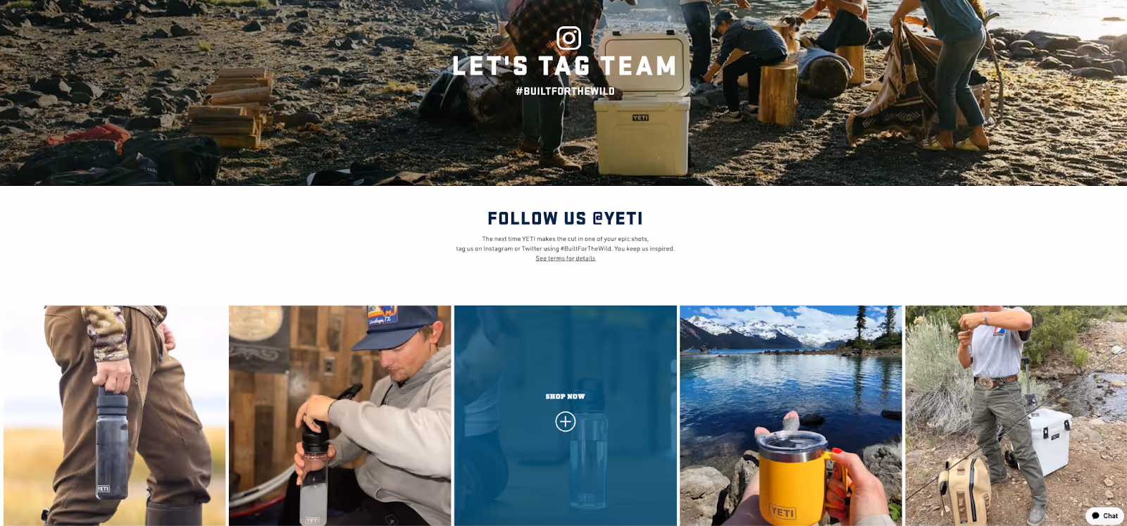 YETI invites customers to share their photos and videos on Instagram under the hashtag #BuiltForTheWild. It then adds each photo to its website with a shoppable link to the relevant products.