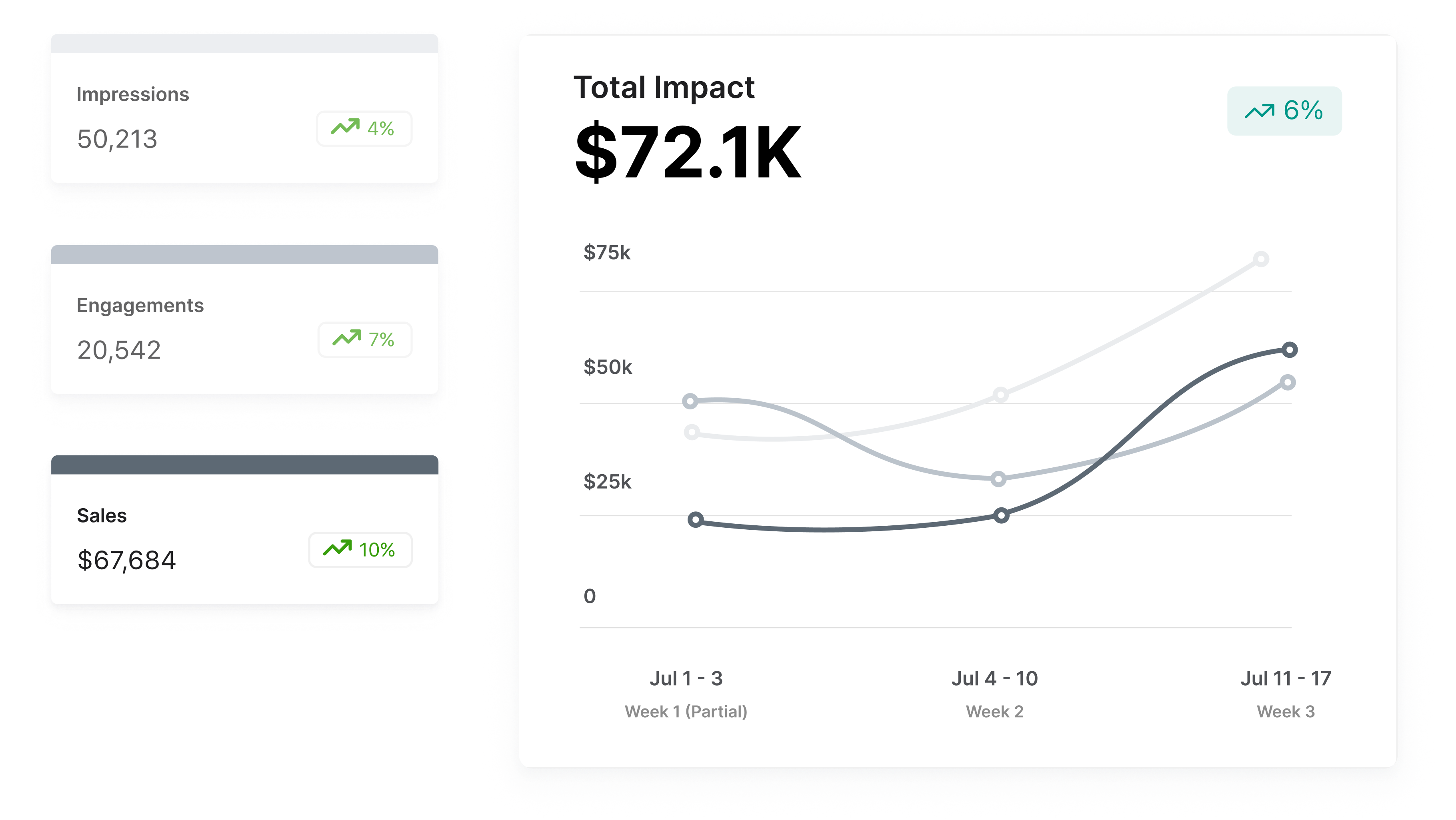 The Impact Dashboard works across two surfaces: a quick snapshot on your homepage and a full breakdown in Reporting. Together, they cover both the at-a-glance check-in and the deep dive.