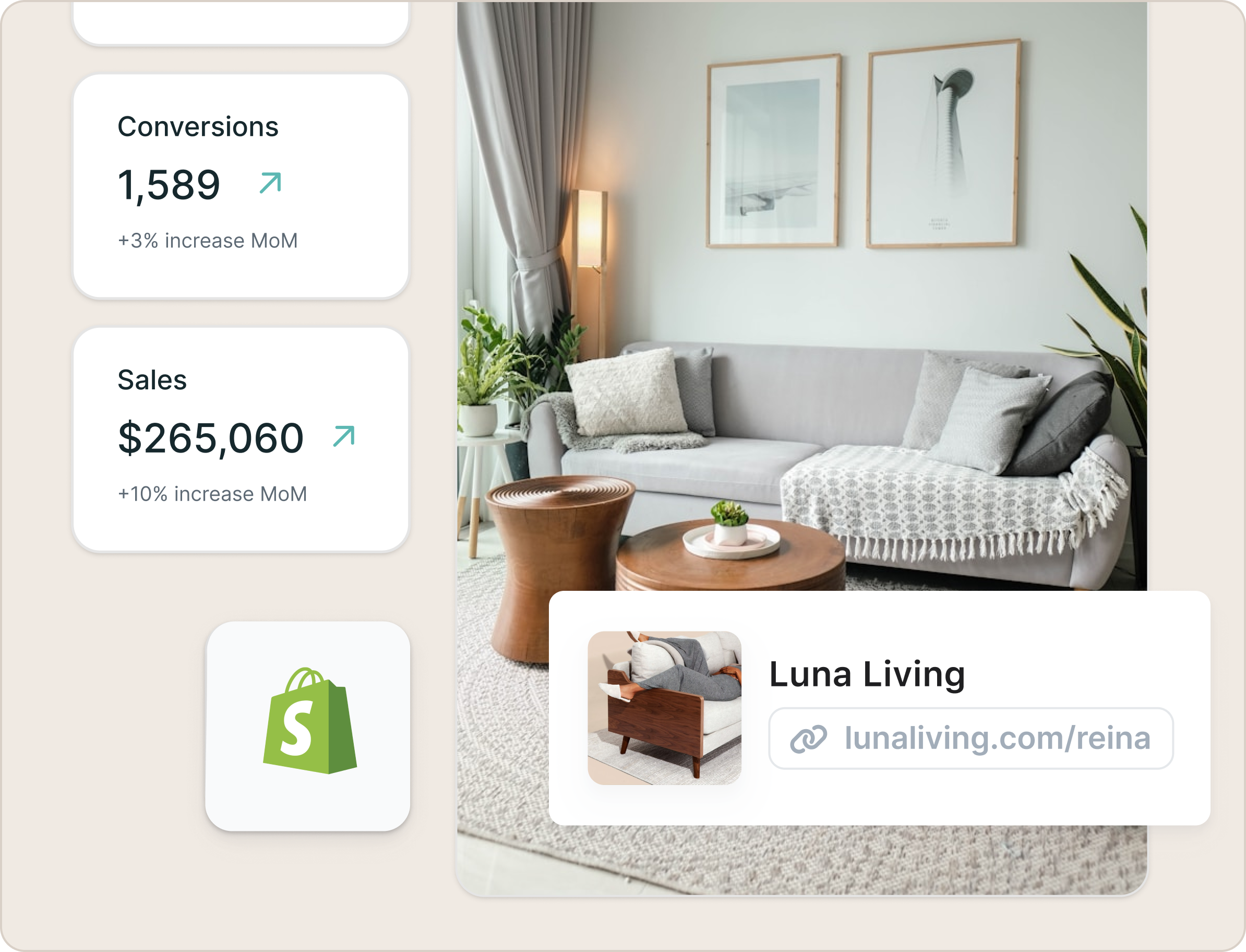 Sales data pulls from Shopify the moment a code is redeemed. No pixel, no CSV upload, no manual reconciliation.