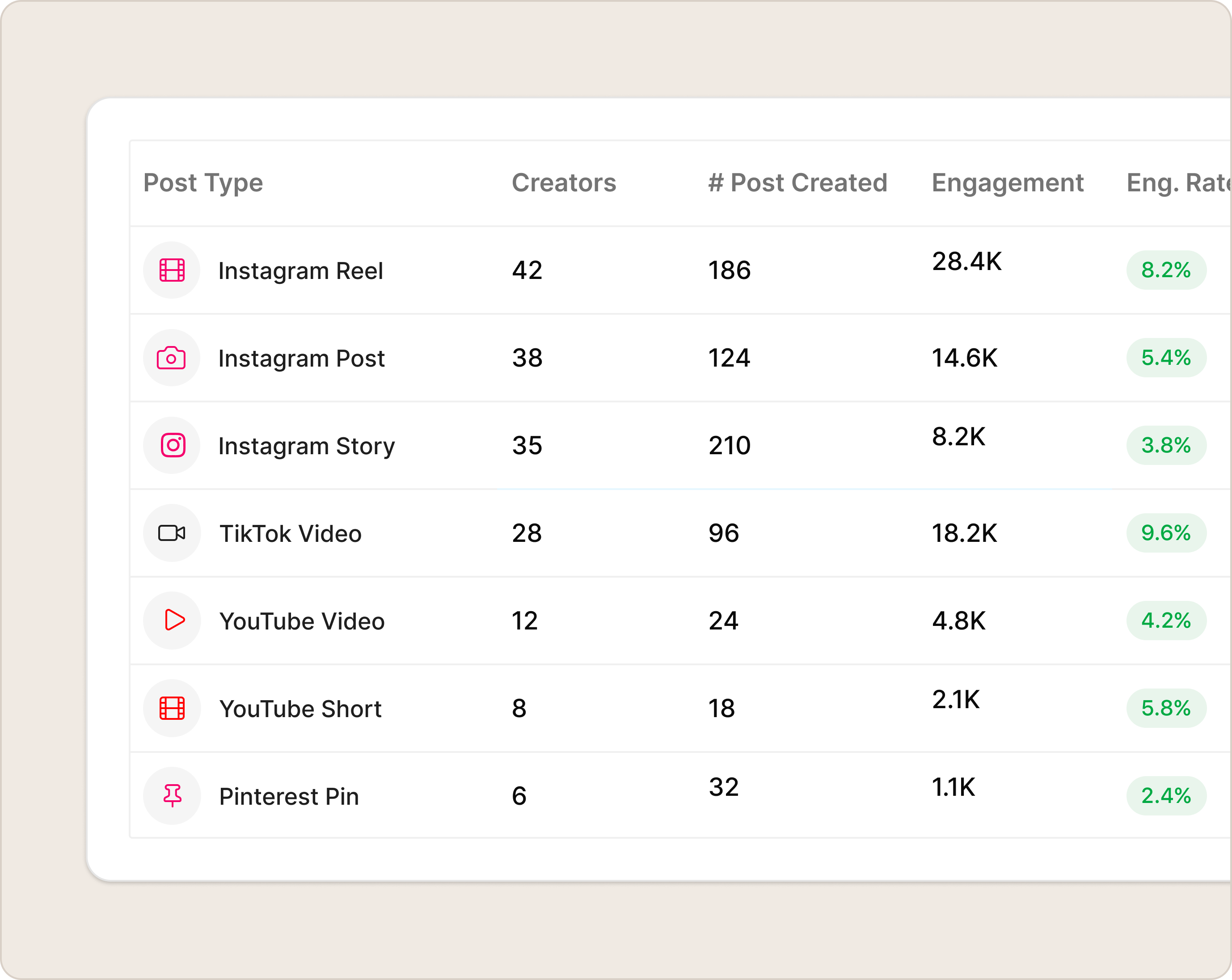 See which networks are pulling their weight and which post types are performing best on each one.
