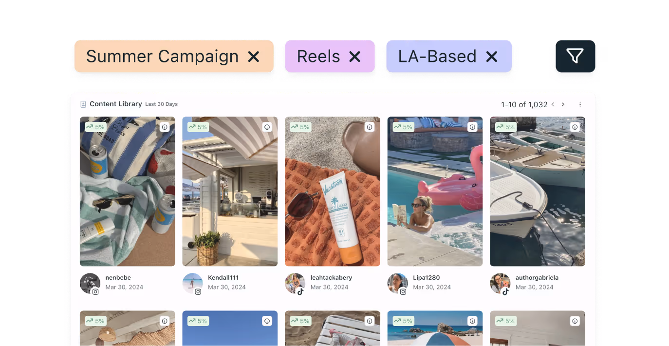 Find all your creators’ posts in Aspire’s Content Library. Search and filter by campaign, tags, creator, or product.
