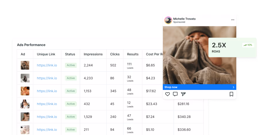 Launch Meta ads directly from Aspire. Automate A/B testing to double down on winners. Compare paid vs. organic performance side-by-side.