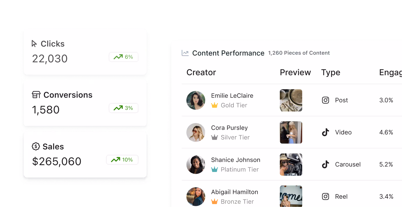 Track performance over time to find the optimal mix of content, creators, and affiliate incentives to drive the most ROI.